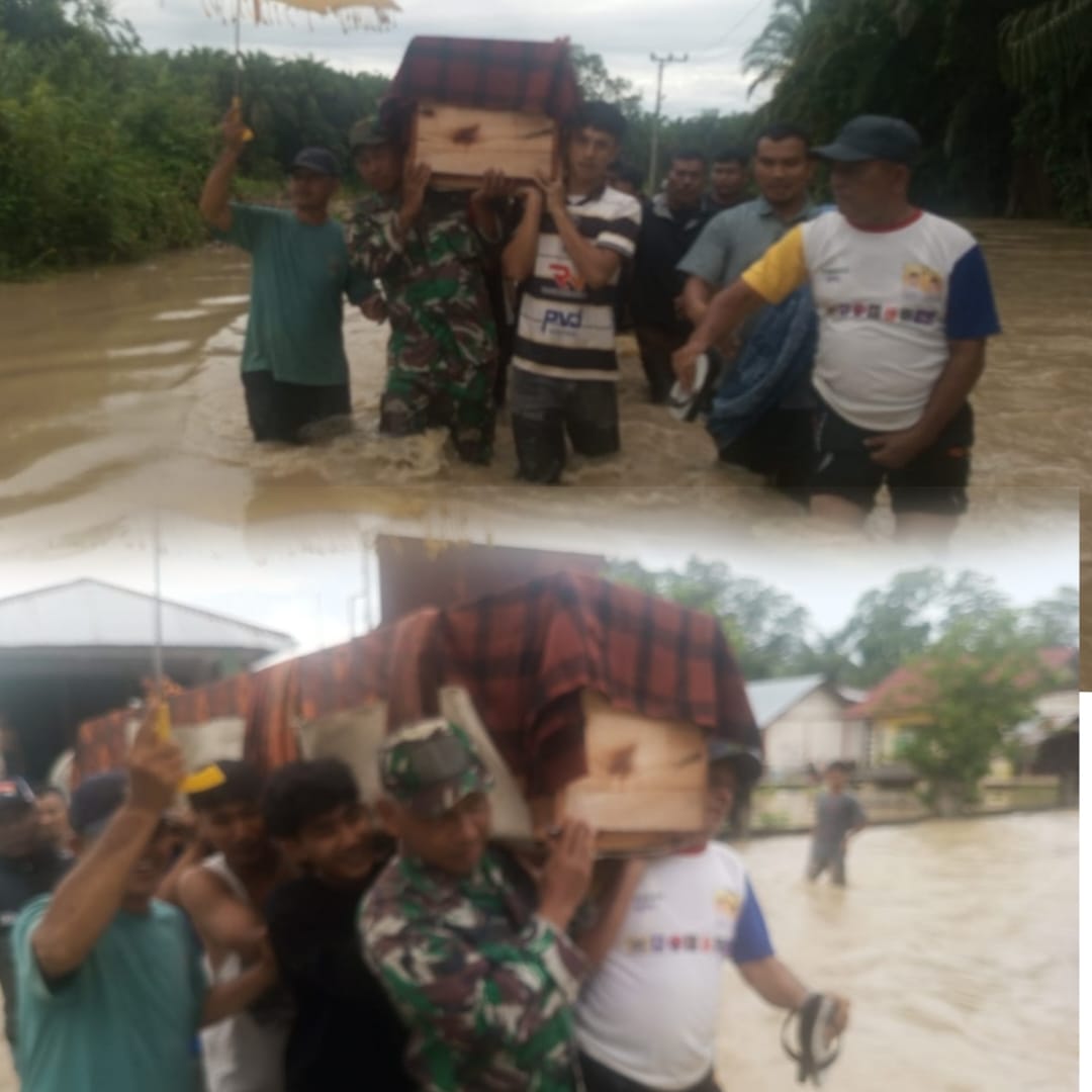 TSN || Aceh Barat – Aksi heroik ditunjukkan oleh Babinsa Koramil 04/Mrb Kodim 0105/Abar Serka Surya Kusmoro yang gerak cepat dan menerabas banjir guna mengevakuasi jenazah Almarhumah Sarimas (72) salah satu warga binaan yang meninggal dunia karena sakit di Desa Pasi Mesjid Kecamatan Meureubo, Jum’at (28/11/2025)