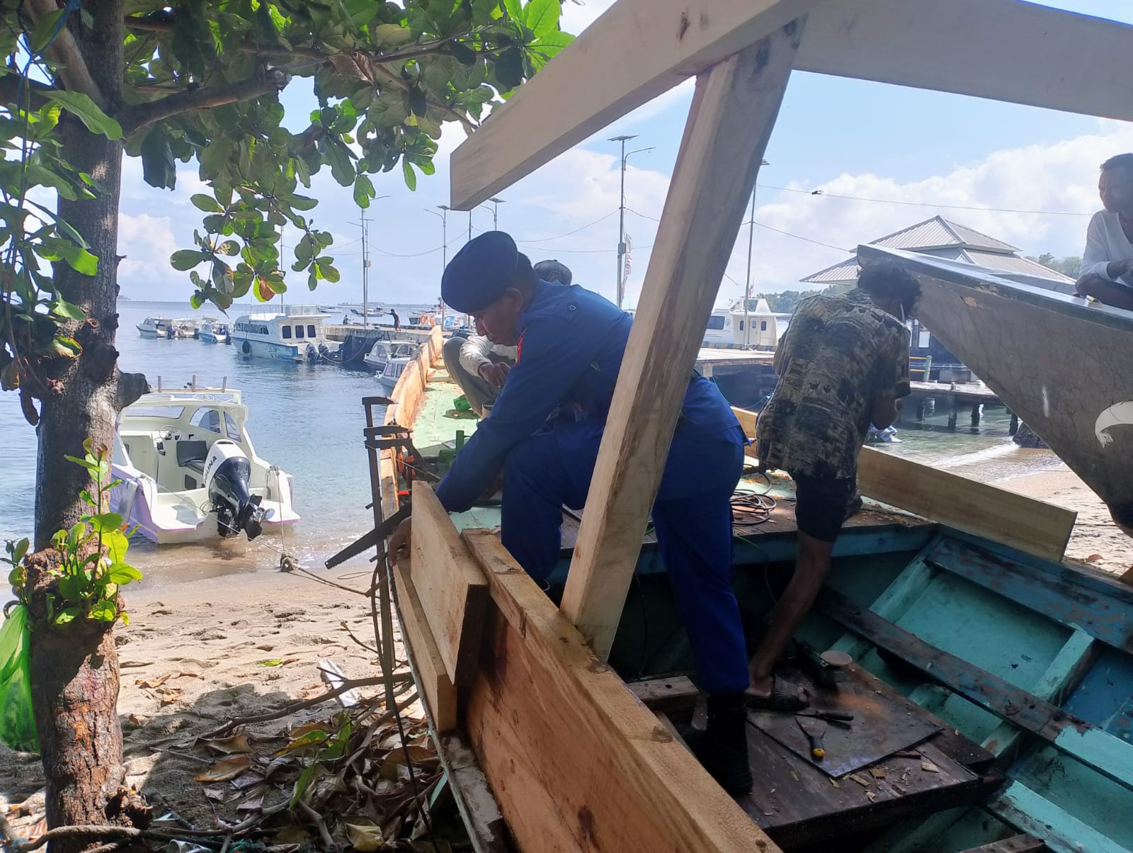 “Kami tidak hanya menjaga keamanan laut, tetapi juga harus hadir ditengah kesulitan masyarakat pesisir. Kapal adalah mata pencaharian mereka. Dengan kemampuan dan tenaga yang kami miliki, kami siap membantu agar kapal-kapal ini dapat segera melaut kembali,” ujar I Gusti dilokasi.