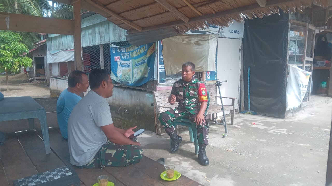 TSN– Samatiga – Dalam rangka memperkuat kemanunggalan TNI dengan rakyat, Babinsa Koramil 09/Samatiga Kodim 0105/Aceh Barat, Sertu Heru Santoso, kembali menunjukkan komitmennya melalui kegiatan komunikasi sosial (Komsos) bersama warga Desa Leukeun, Kecamatan Samatiga, Kegiatan ini menjadi bagian dari rutinitas pemanasan teritorial yang dilakukan secara humanis dan penuh keakraban. Minggu (9/11/2025)