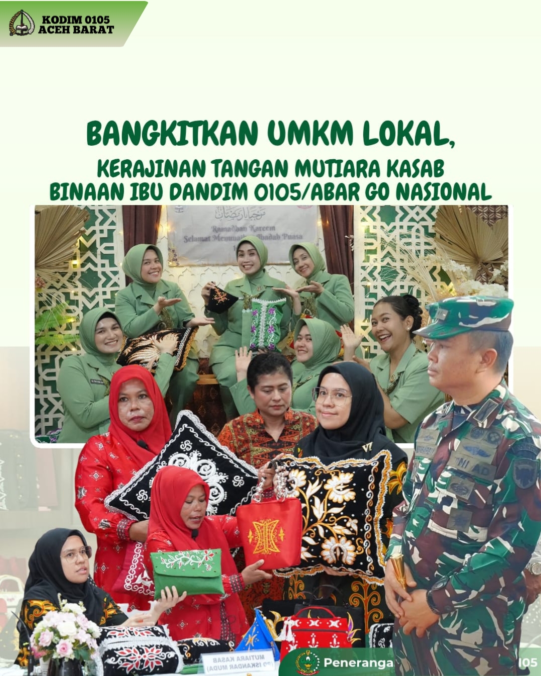 TSN || Aceh Barat – Semangat membangkitkan UMKM lokal terus digaungkan melalui karya kreatif kerajinan tangan Mutiara Kasab khas Aceh yang dibina oleh Ibu Dandim 0105/Abar. Salah satu pengrajin unggulan, anggota Persit Ny. Ema Didik Sulistyo Budi berhasil membawa kerajinan sulam kain kasab menembus panggung nasional.