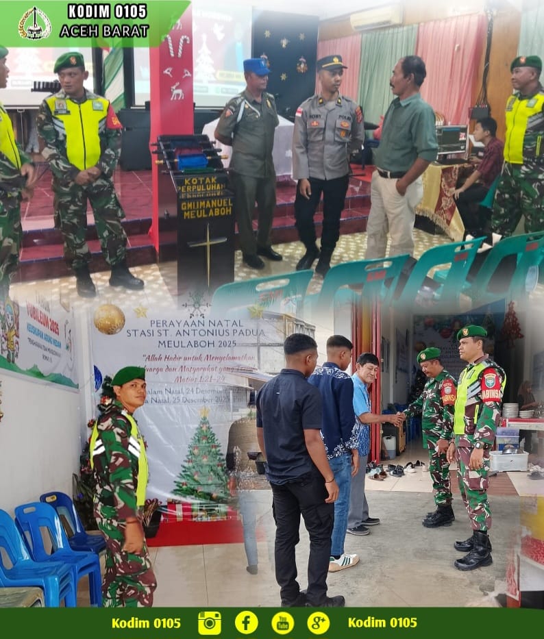TSN || Aceh Barat – Untuk memberikan rasa aman dan nyaman kepada umat Kristiani dalam menjalankan kebaktian Natal, Prajurit Kodim 0105/Abar bersama Polri dan Satpol PP melaksanakan pengamanan di Gereja Methodist Injil Indonesia (GMII) Suka Cita dan Gereja Katholik Indonesia (GKI) Santa Antonius yang berada di Desa Ujong Baroh Kecamatan Johan Pahlawan, Kamis (25/12/2025)