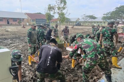 TSN || Aceh Utara – Personel Koramil 04/Muara Batu bersama personel Yon Zipur 17/AD Kodam VI/Mulawarman melaksanakan kegiatan pembersihan fasilitas Sekolah Menengah Kejuruan (SMK) 1 Muara Batu yang be...