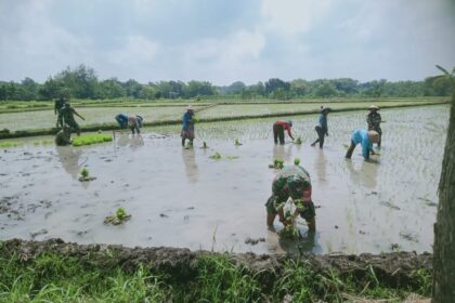 TSN || Sragen, Wujud nyata kedekatan TNI dengan rakyat kembali ditunjukkan oleh Babinsa Koramil 16/Miri Kodim 0725/Sragen Serda Triyanto yang turun langsung ke sawah membantu petani menanam padi. Deng...