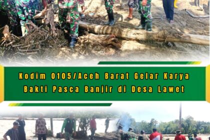TSN || Aceh Barat – Sebagai bentuk kepedulian dan tanggung jawab sosial terhadap masyarakat yang terdampak bencana alam, prajurit Kodim 0105/Aceh Barat melaksanakan kegiatan karya bakti pasca banjir d...