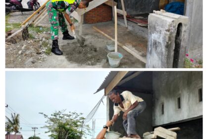 TSN || Meulaboh -Sertu Agustino, Babinsa Koramil 07/Johan Pahlawan, Kodim 0105/Aceh Barat, singsingkan lengan baju bantu warga bangun rumah di desa Gampa. Minggu (19-04-2026). Tanpa ragu ia ikut angka...