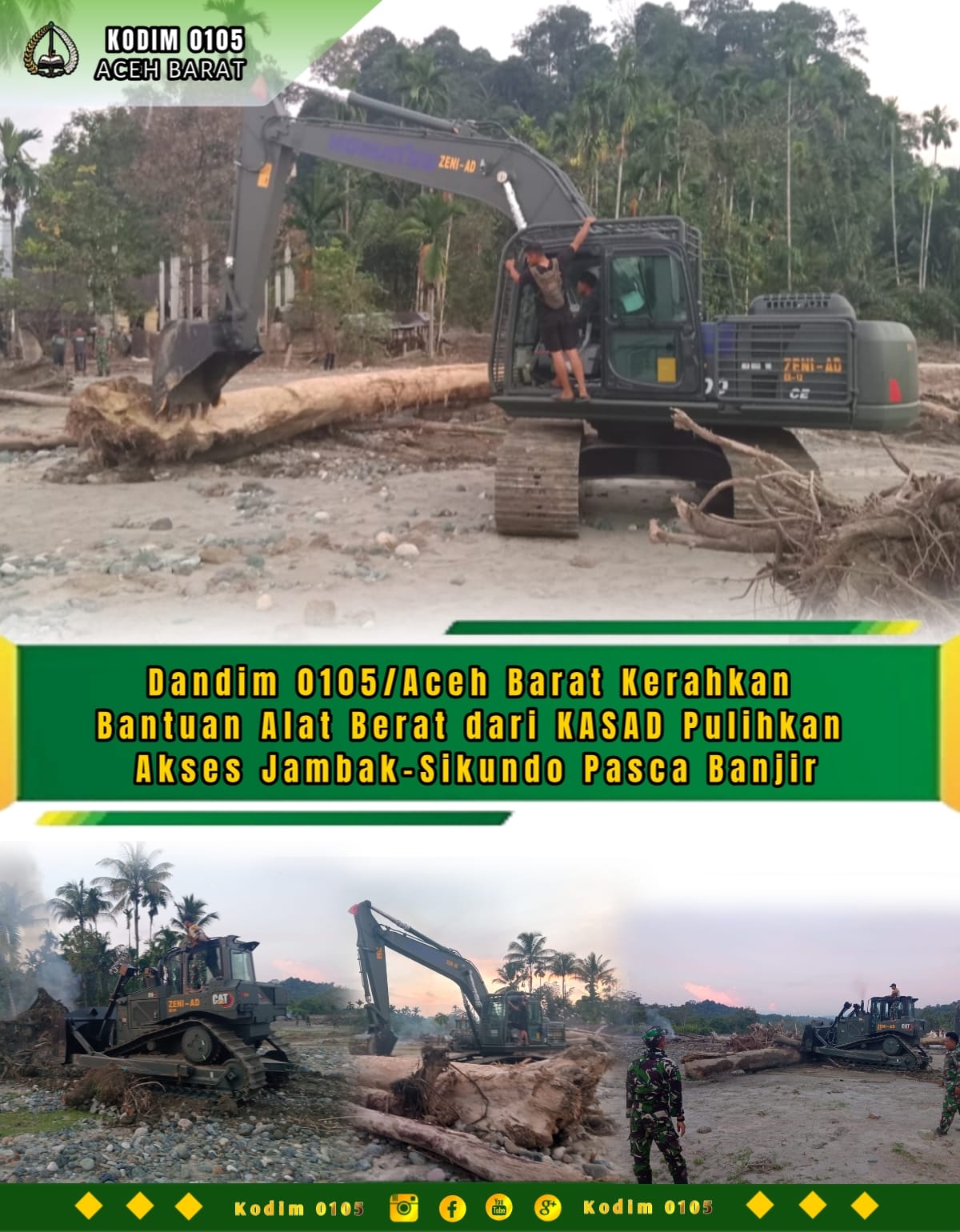 Untuk mempercepat pemulihan, dua unit alat berat dan dua dump truck bantuan dari Bapak Kepala Staf Angkatan Darat (KASAD) diturunkan menembus medan berat berupa tanah berlumpur, semak belukar, serta menyingkirkan gelondongan kayu yang menghalangi jalur. Dandim menegaskan agar pengerjaan dilakukan dengan maksimal demi mempercepat pemulihan akses.
