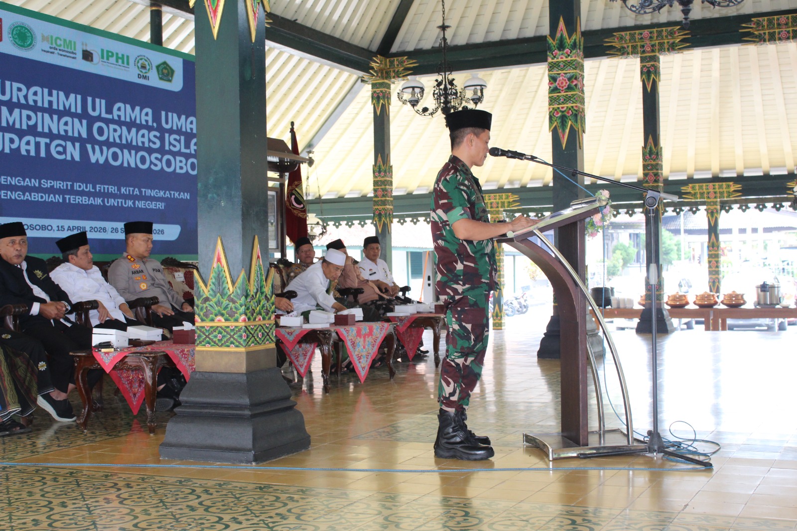 TSN || Wonosobo –Dandim 0707/Wonosobo Letkol Inf Yoyok Suyitno, S.Sos memberikan sambutan dalam acara Halal Bihalal Majelis Ulama Indonesia (MUI) Kabupaten Wonosobo yang digelar di Pendopo Kabupaten Wonosobo.Dandim menekankan bahwa Idul Fitri bukan sekadar ajang saling memaafkan, melainkan momentum penting untuk memperkuat ukhuwah islamiyah, mempererat silaturahmi, serta memperkokoh persatuan dan kesatuan bangsa. (15/4/2026)