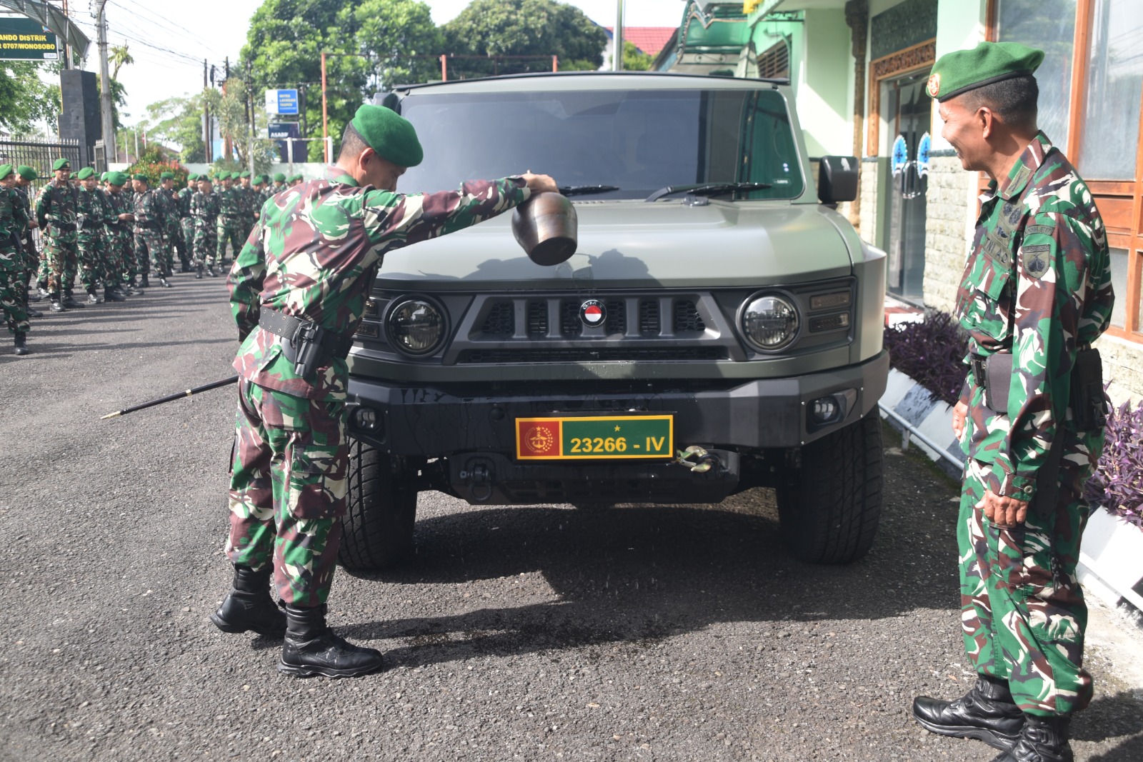 TSN || Wonosobo – Dandim 0707/Wonosobo Letkol Inf Yoyok Suyitno S. Sos memecahkan kendi tanah liat di depan mobil dinas baru jenis Maung sebagai tanda resmi dimulainya penggunaan kendaraan taktis tersebut. Acara ini berlangsung di Markas Kodim 0707/Wonosobo, Senin (2/3/2026).