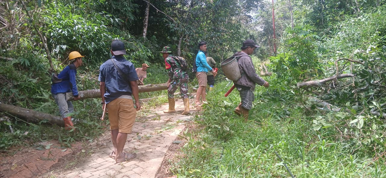 TSN || BARABAI – Babinsa Koramil 1002-01/Batang Alai Selatan, Serda Erli Sepriyanto bersama warga masyarakat Desa Atiran melaksanakan kegiatan gotong royong pembersihan jalan sepanjang kurang lebih 2,5 kilometer dalam rangka penyiapan instalasi program listrik desa, Selasa (7/4).