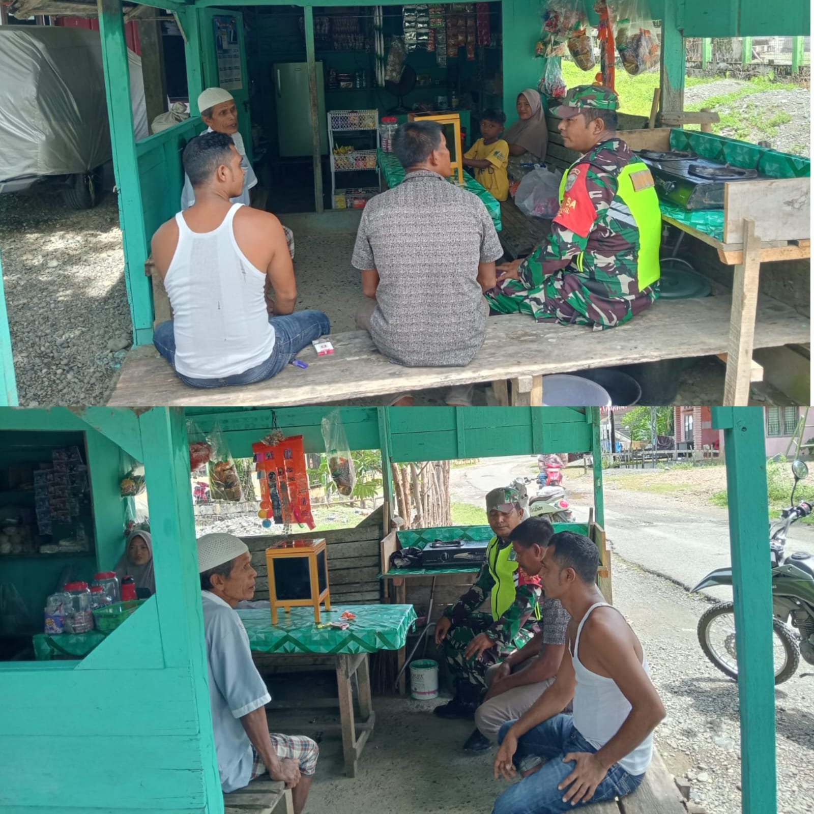 Terlihat Babinsa duduk santai di sebuah keudai (warung kopi), tempat yang memang menjadi pusat berkumpulnya warga di wilayah tersebut.