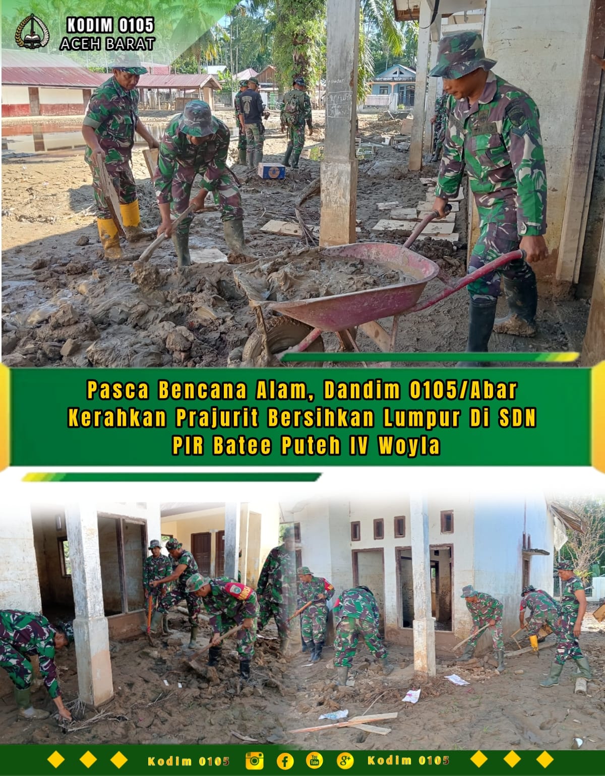 TSN || Aceh Barat – Setelah wilayah Aceh Barat dilanda bencana alam beberapa waktu lalu, Komandan Kodim 0105/Aceh Barat Letkol Inf S Kembaren,S.E.,M.I.P.,CFrA. langsung mengambil langkah cepat dengan menginstruksikan seluruh jajaran Prajurit untuk melaksanakan pembersihan fasilitas umum. Layaknya hari ini menggelar aksi kemanusiaan membersihkan lumpur di SDN PIR Batee Puteh IV Desa Pasi Birah Kecamatan Woyla Induk, Minggu (11/1/2026)
