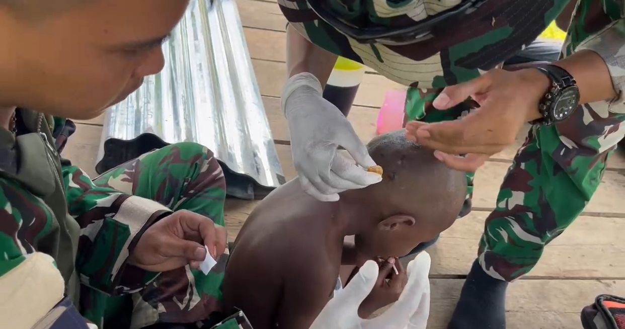 TSN || Selal, Pegunungan Bintang — Pos Selal Satgas Pamtas RI–PNG Yonif 751/Vira Jaya Sakti (VJS) melayani pengobatan bagi anak-anak yang mengalami keluhan cacar/ruam dan bisul yang diduga dipicu kebersihan lingkungan yang kurang terjaga. Layanan dibuka gratis untuk warga sekitar pos sebagai wujud kepedulian TNI terhadap kesehatan masyarakat perbatasan.(Selasa,2/11/2025).