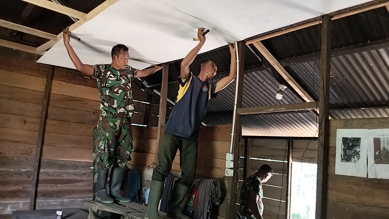 Suasana kerja di lokasi tampak penuh kebersamaan. Personel Satgas TMMD dan warga saling bahu-membahu memasang rangka plafon serta menyiapkan material dengan penuh ketelitian agar hasilnya kuat dan rapi