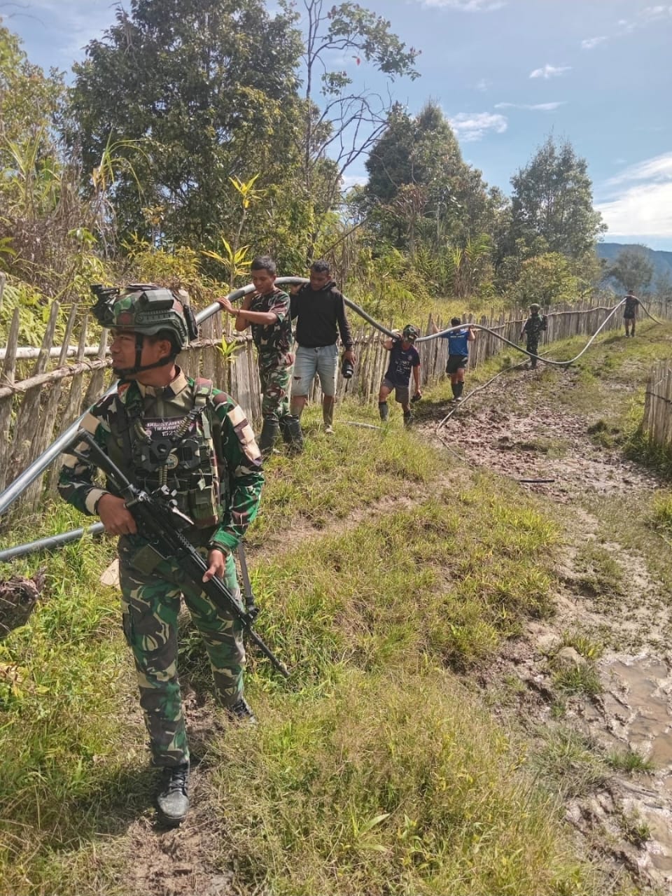 TSN || Distrik Okaom, Pegunungan Bintang Di bawah naungan Koops Swasembada, Satgas Pamtas Statis Yonif 751/Vira Jaya Sakti (VJS) melaksanakan program TNI Manunggal Air di Kampung Bulangkop Distrik Okaom. Inisiatif ini ditujukan untuk mencegah kekeringan saat musim kemarau sekaligus memastikan pasokan air bersih yang andal bagi masyarakat di sekitar pos perbatasan (Selasa, 25/11/2025).