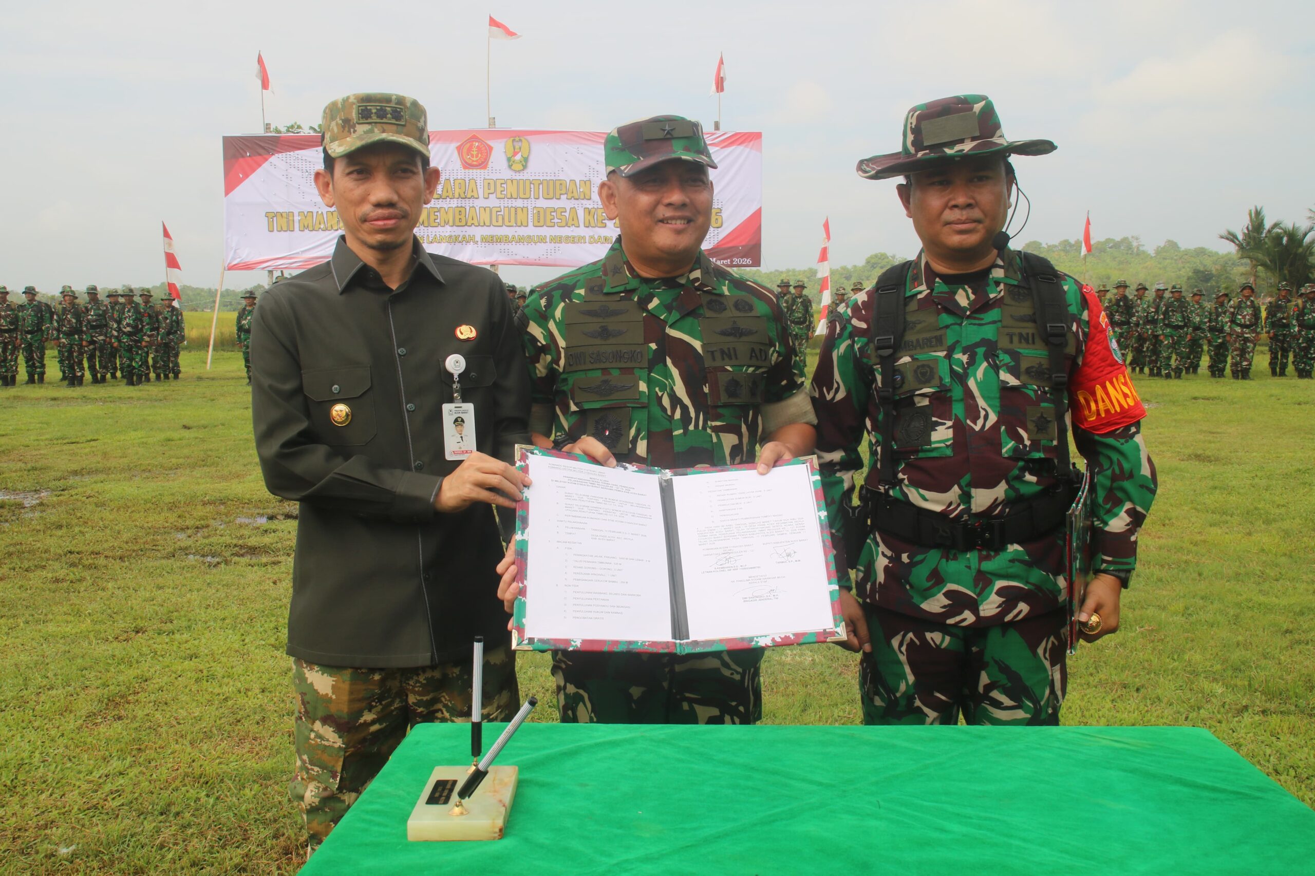 Dalam amanatnya juga disampaikan apresiasi kepada Pemerintah Kabupaten Aceh Barat yang telah memberikan dukungan penuh melalui alokasi anggaran APBD, serta kepada seluruh personel Satgas TMMD, mitra TNI AD, dan masyarakat yang telah bahu-membahu menyukseskan program tersebut.