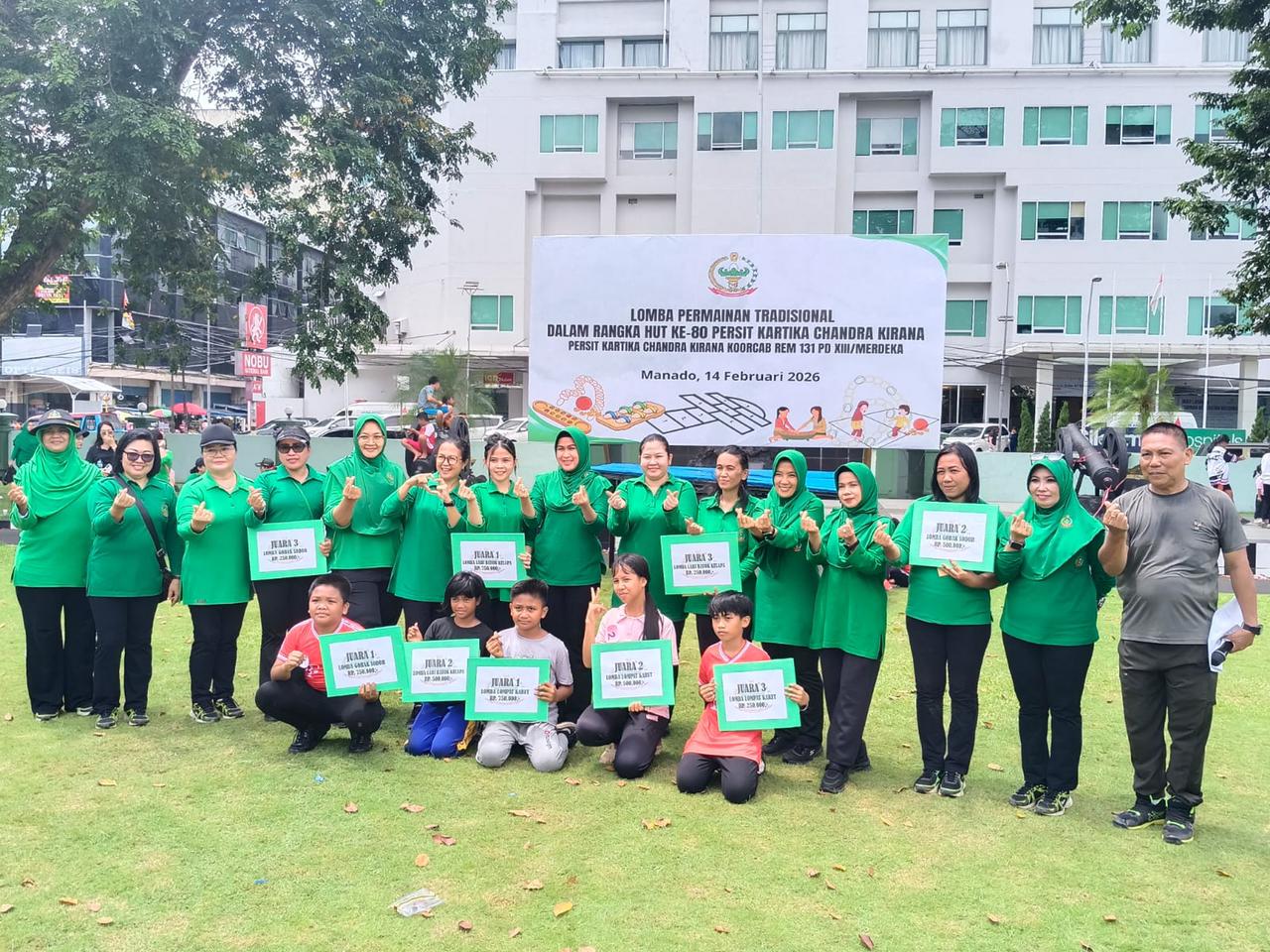 Dari hasil lomba yang diselenggarakan panitia, Persit KCK Cabang LXII Kodim 1310/Bitung berhasil meraih Juara 2 pada Lomba Gobak Sador dan Lomba Lari Batok Kelapa.