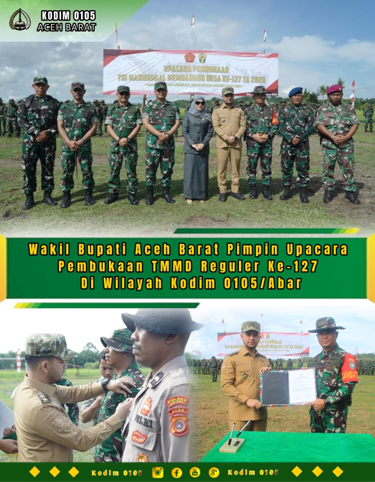 TSN || Aceh Barat – Program TNI Manunggal Membangun Desa (TMMD) Reguler ke-127 wilayah Kodim 0105/Abar secara resmi telah dibuka oleh Wakil Bupati Aceh Barat Said Fadheil, S.H., Upacara yang mengusung tema “TMMD Satukan Langkah, Membangun Negeri Dari Desa”, ini digelar di Lapangan Bola Kaki Desa Lueng Jawa Kecamatan Woyla, Selasa (10/2/2026)